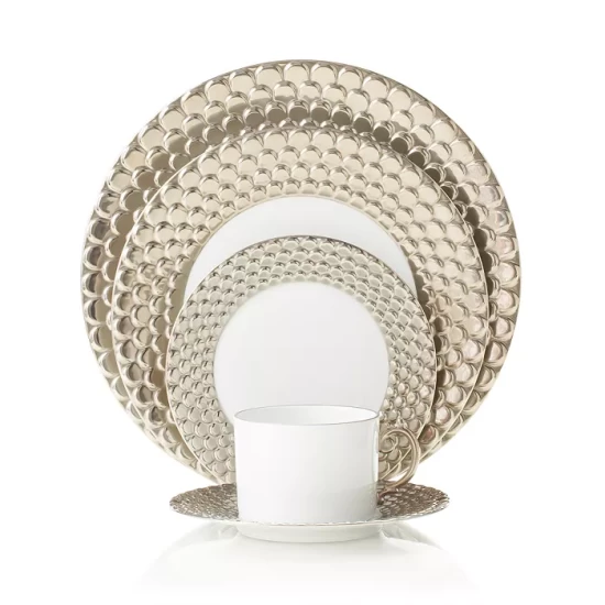 A delicately scalloped pattern inspired by the Aegean Sea’s gentle waves details this fine porcelain dinnerware from L’Objet.