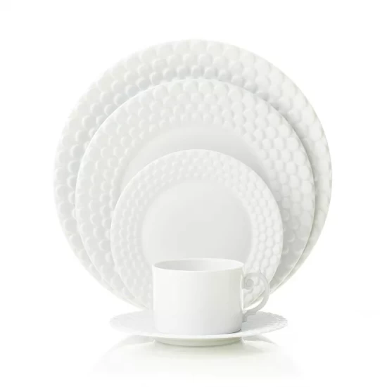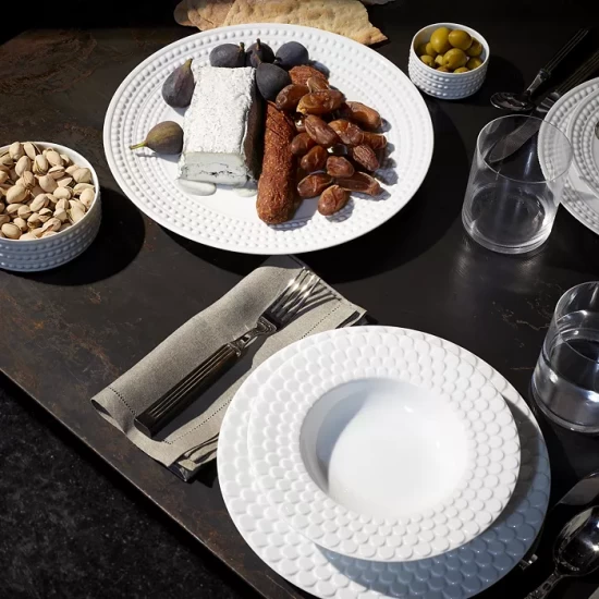 A delicately scalloped pattern inspired by the Aegean Sea’s gentle waves details this fine porcelain dinnerware from L’Objet.