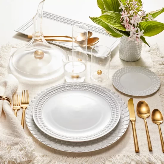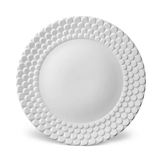 A delicately scalloped pattern inspired by the Aegean Sea’s gentle waves details this fine porcelain dinnerware from L’Objet.