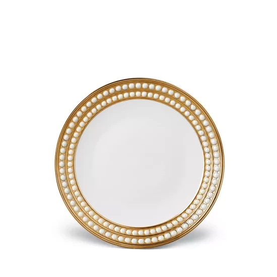 The refined beauty of natural pearls informed this elegant dinnerware from L’Objet. Vivid white Limoges porcelain is accented with hand-painted 24K gold details.