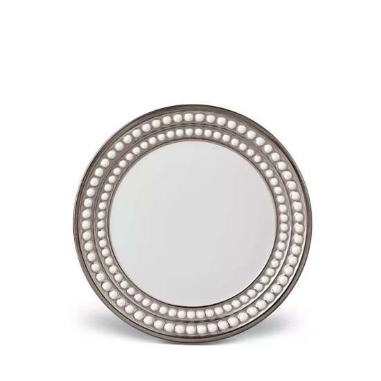 The refined beauty of natural pearls informed this elegant dinnerware from L’Objet. Vivid white Limoges porcelain is accented with hand-painted platinum details.