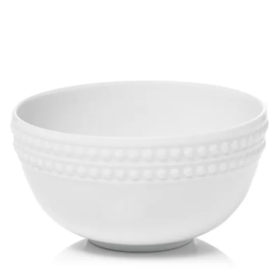 The refined beauty of natural pearls informed this elegant white porcelain dinnerware from L’Objet.