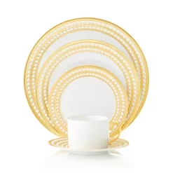 The refined beauty of natural pearls informed this elegant dinnerware from L’Objet. Vivid white Limoges porcelain is accented with hand-painted 24K gold details.