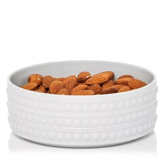 The refined beauty of natural pearls informed this elegant white porcelain dinnerware from L’Objet.