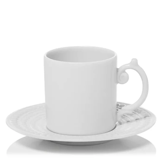 The refined beauty of natural pearls informed this elegant white porcelain dinnerware from L’Objet.