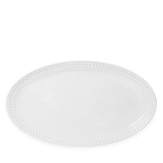 The refined beauty of natural pearls informed this elegant white porcelain dinnerware from L’Objet.