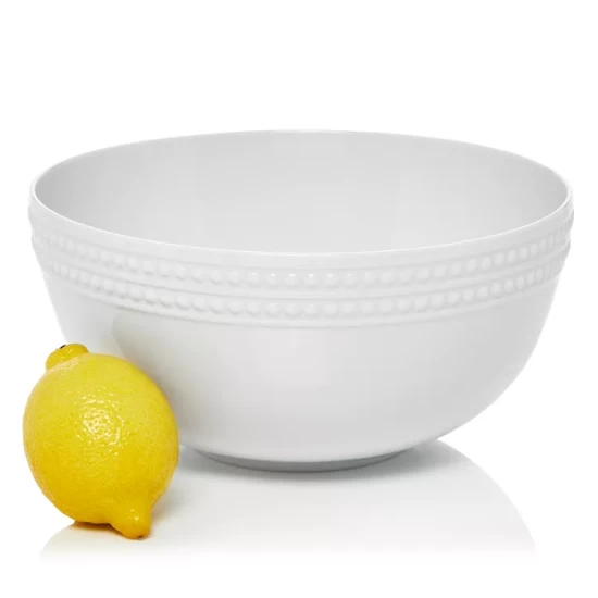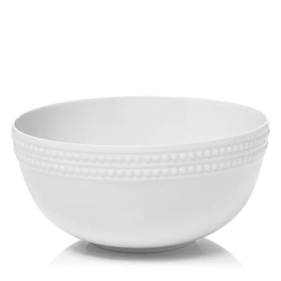 The refined beauty of natural pearls informed this elegant white porcelain dinnerware from L’Objet.