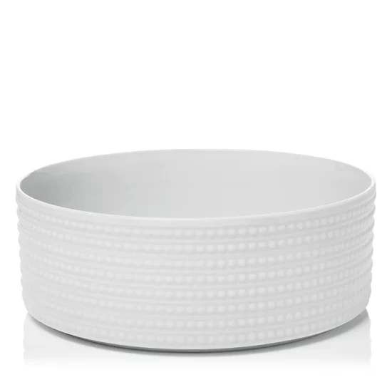 The refined beauty of natural pearls informed this elegant white porcelain dinnerware from L’Objet.